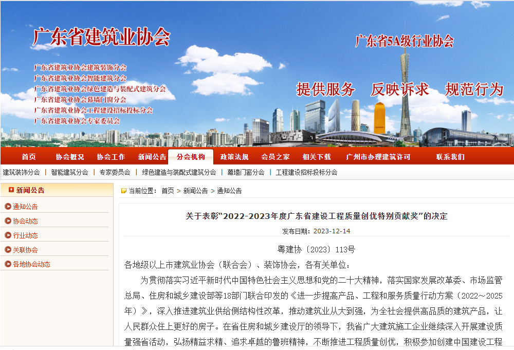 近日,廣東省建筑業(yè)協(xié)會發(fā)布了《關(guān)于表彰“2022-2023年度廣東省建設(shè)工程質(zhì)量創(chuàng)優(yōu)特別貢獻獎”的決定》。因創(chuàng)優(yōu)工作成績顯著,中裝建設(shè)被授予“2022-2023年度廣東省建設(shè)工程質(zhì)量創(chuàng)優(yōu)特別貢獻獎”榮譽稱號。